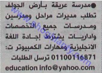 تعلن مدرسة عريقة بأرض الجولف حاجتها عن شغل وظائف مدرسين ومدرسات ومديرات فى جميع التخصصات، يسترط إجادة اللغة الانجليزية والتعامل مع الكمبيوتر، وعلى الراغبين فى ضغل الوظائف الاتصال برقم 01100116871، أو على الايميل التالى:- education [email protected]