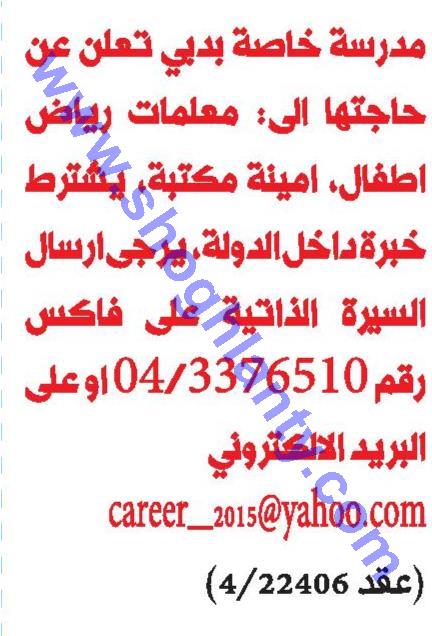 تعلن مدرسة خاصة بدبى عن جاجتها لمعلمات رياض اطفال، امينة مكتبة، وعلى الراغبين فى التقدم اسرال السيرة الذاتية على الفاكس رقم 04/3376510 أو على البريد الالكترونى التالى:- [email protected]