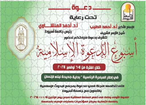 تستضيف جامعة أسيوط، اعتبارًا من غدٍ الإثنين 4 نوفمبر، فعاليات "أسبوع الدعوة الإسلامية" تحت عنوان: «العقيدة وبناء الإنسان»، بتنظيم من اللجنة العليا للدعوة بمجمع البحوث الإسلامية، وبرعاية الدكتور أحمد المنشاوي، رئيس جامعة أسيوط، تنفيذًا لتوجيهات فضيلة الإمام الأكبر الدكتور أحمد الطيب، شيخ الأزهر، لتعزيز الأنشطة الدعوية والتوعوية، في إطار رسالة الأزهر ودوره الرائد.