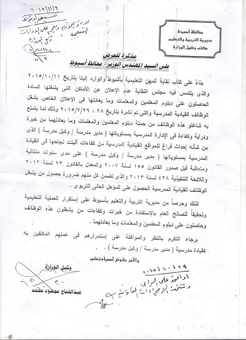 فقد قام العسقلاني مطلع أكتوبر الماضي بمخاطبة عبد الفتاح محمود وكيل وزارة التربية والتعليم بأسيوط يطالبه بعدم الإعلان عن الأماكن التي يشغلها السادة الحاصلون على دبلوم المعلمين والمعلمات وما يعادلها، وذلك وفقاً للإعلان الخاص بشغل الوظائف القيادية المدرسية المنشور بتاريخ 28 و 29 من يوليو الماضي.
