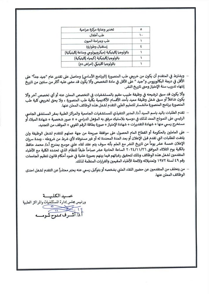 وعلى العاملين بالحكومة أو القطاع العام الحصول على موافقة صريحة من جهة عملهم للتقدم لشغل الوظيفة، ولن يلتفت للطلبات التي تقدم قبل الإعلان أو بعد المدة المحددة له أو غير مستوفاه لأي شرط من شروطه – ومدة سريان الإعلان خمسة عشر يومًا من تاريخ النشر، مع العلم بأنه سوف يتم عقد لقاء علني موسع بمدرج أ.د/ محمد حافظ بالكلية يوم الثلاثاء الموافق ٢٠٢٤/١١/٢٦ الساعة الحادية عشر صباحًا طبقًا للنظام الذي تحدده الكلية مع الأطباء المتقدمين لشغل هذه الوظائف، وذلك لتحقيق رغباتهم فيما بينهم بصورة علنية في ضوء أحكام قانون تنظيم الجامعات رقم ٤٩ لسنة ۱۹۷۲ وتعديلاته ولائحة الأطباء المقيمين والقرارات المنظمة لذلك.