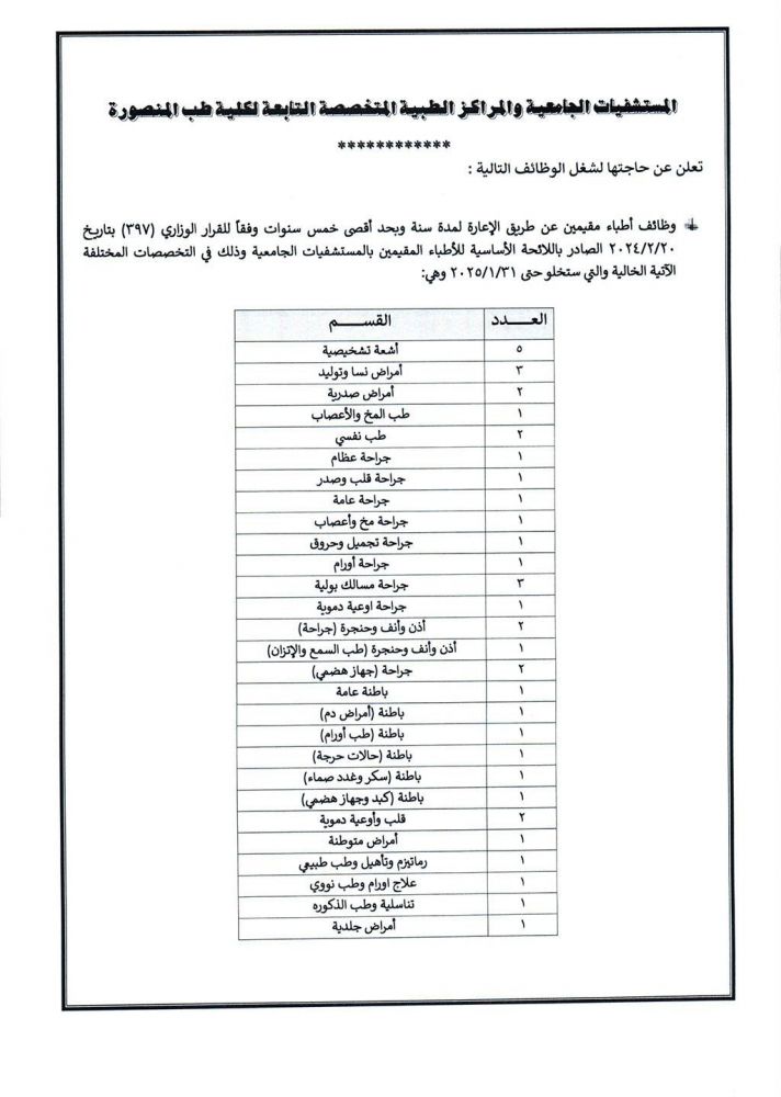 تعلن المستشفيات الجامعية والمراكز الطبية المتخصصة التابعة لكلية طب جامعة المنصورة لشغل الوظائف التالية.. وظائف أطباء مقيمين عن طريق الاعارة لمدة سنة وبحد أقصى خمس سنوات وفقًا للقرار الوزارى (397) بتاريخ 20 /2 /2024 الصادر باللائحة الاساسية للأطباء المقيمين بالمستشفيات الجامعية وذلك فى التخصصات المختلفة الاتية الخالية والتى ستخلو حتى 31/ 1/ 2025 وهى: