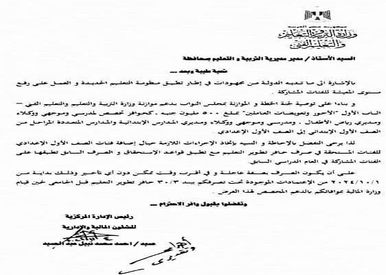 قررت وزارة التربية والتعليم والتعليم الفني إدراج الموجهين، المعلمين، الإداريين ومديري المدارس بالصف الأول الإعدادي ضمن الفئات المستفيدة من حافز تطوير التعليم في إطار منظومة التعليم الجديدة "2.0". وبذلك، أصبح جميع العاملين من رياض الأطفال حتى الصف الأول الإعدادي مؤهلين للحصول على حافز شهري يتجاوز 800 جنيه، وذلك ضمن الجهود المستمرة لتطوير النظام التعليمي ورفع مستوى معيشة العاملين في هذه الصفوف.