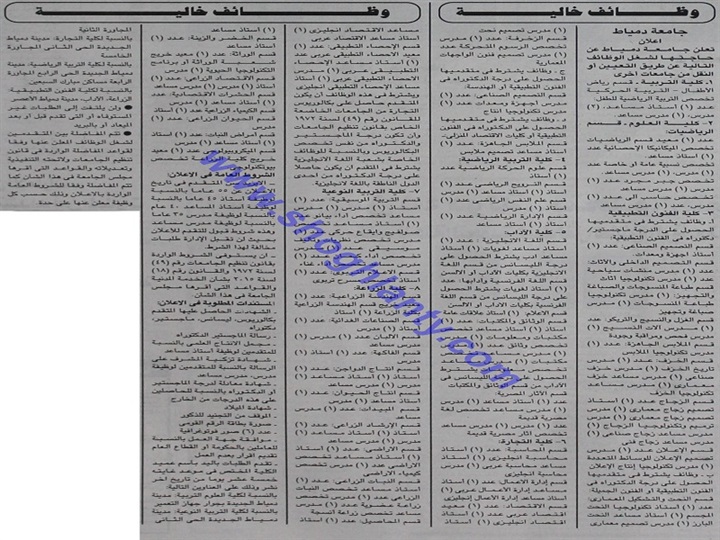 تعلن جامعة دمياط عن حاجتها لشغل العديد من الوظائف الشاغرة فى جميع الكليات، وعلى الراغبين فى التقدم، تقديم السيرة الذاتية باسم عميد الكلية باليد.