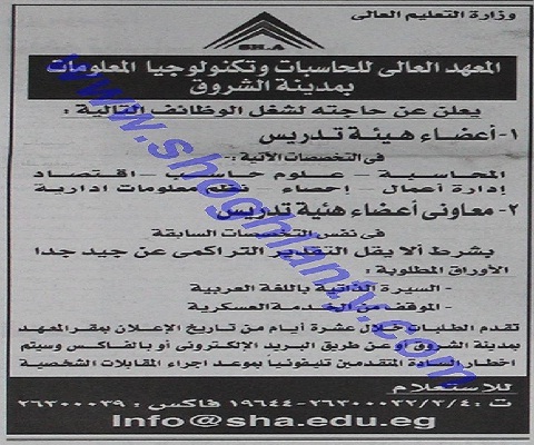 يعلن المعهد العالى للحاسبات وتكنولوجيا المعلومات بمدينة الشروق عن حاجته لشغل وظائف اعضاء هيئة تدريس، فى جميع التخصصات، وعلى الراغبين تقديم السيرة الذاتية خلال 10 أيام من تاريخ الاعلان بمقر المعهد، بمدينة الشروق أو عن طريق البريد الالكترونى التالى: [email protected]
