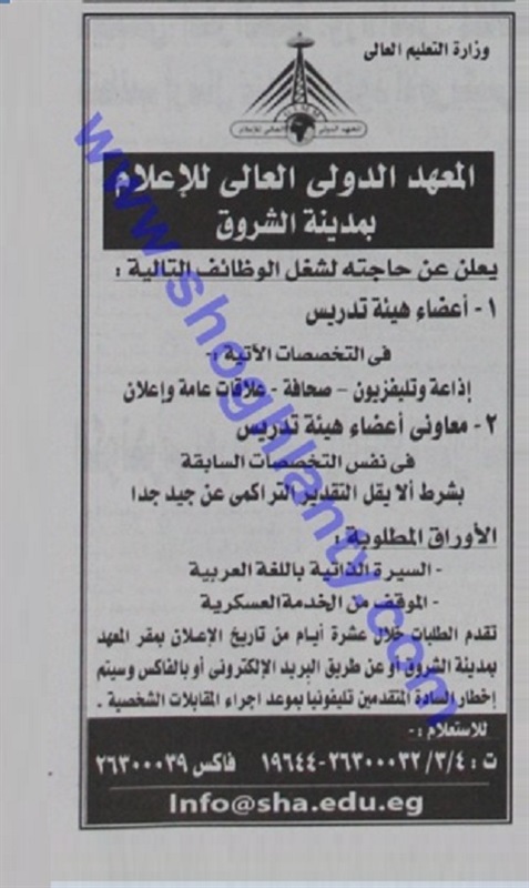 يعلن المعهد الدولى العالى للإعلام بمدينة الشروق عن حاجته لشغل وظائف اعضاء هيئة تدريس، فى جميع التخصصات، وعلى الراغبين تقديم السيرة الذاتية خلال 10 أيام من تاريخ الاعلان بمقر المعهد، بمدينة الشروق أو عن طريق البريد الالكترونى التالى: [email protected]