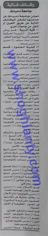 تعلن جامعة دمياط عن حاجتها لشغل وظائف لاعضاء هيئة التدريس فى جميع التخصصات، وعلى الراغبين فى التقدم تسليم السيرة الذاتية باسم عميد الكلية الراغب فى التقدم اليها بمقر الجامعة.