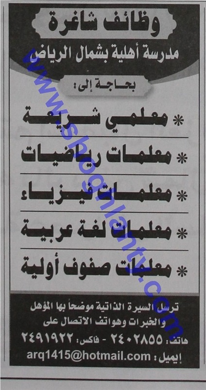تعلن مدرسة أهلية بشمال الرياض بالمملكة العربية السعودية عن حاجتها للتعاقد مع معلمين في المواد التالية: