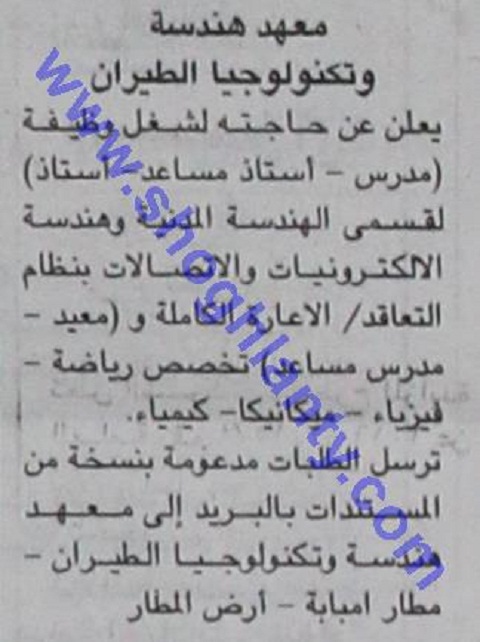 يعلن معهد هندسة وتكنولوجيا الطيران عن حاجته للتعاقد مع اعضاء هيئة تدريس جدد وذلك في التخصصات التالية :
