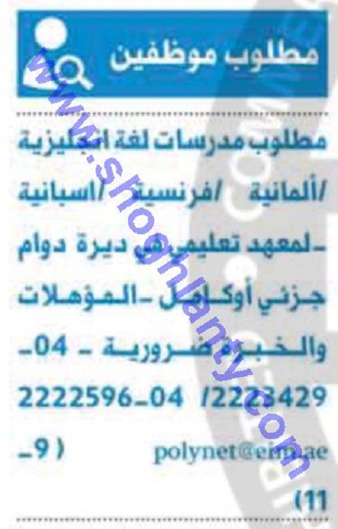 أعلن معهد تعليمي في ديرة بدولة الإمارات العربية عن حاجتها للتعاقد مع معلمين وذلك في التخصصات التالية: