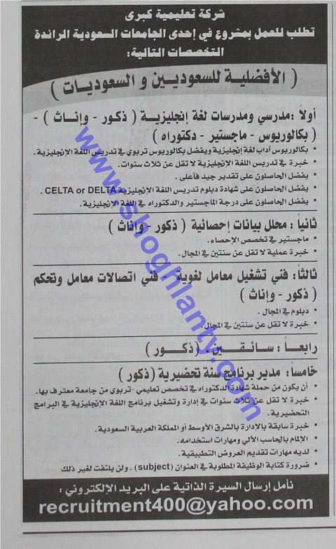 وعلي الراغبين في التقديم ارسال السيرة الذاتية عي البريد الالكتروني : [email protected]