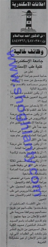 تعلن جامعة الاسكندرية عن وظائف شاغرة لاعضاء هيئة تدريس، وعلى الراغبين فى التقدم تسليم الاوراق المطلوبة بمقر الجامعة خلال أسبوعين من نشر الاعلان.