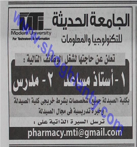 تعلن الجامعة الحديثة للتكنولوجيا والمعلومات عن حاجتها لشغل عدد من الوظائف لاعضاء هيئة التدريس، وعلى الراغبين فى التقدم ارسال السسيرة الذاتية على الايميل التالى:- [email protected]