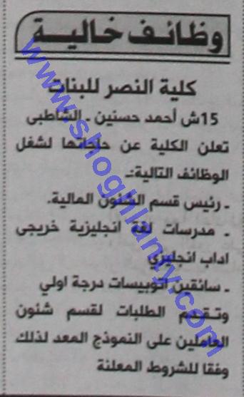 تعلن كلية النصر للبنات عن حاجتها لشغل عدد من الوظائف لاعضاء هيئة تدريس، وكذلك سائقين درجة أولى، وعلى الرغبين فى شغل هذه الوظائف الذهاب إلى مقر الكلية على العنوان التالى:- 15 شارع أحمد حسنين - الشاطبى - محافظة الاسكندرية.