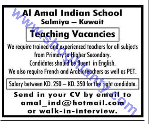 تعلن مدرسة خاصة في دولة الكويت عن حاجتها للتعاقد مع معلمين وذلك في التخصصات التالية: