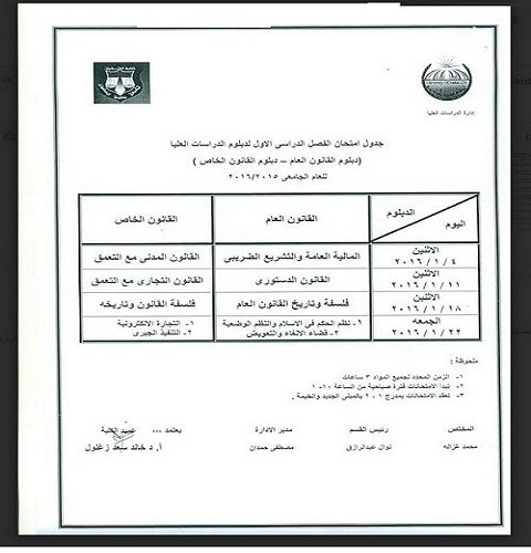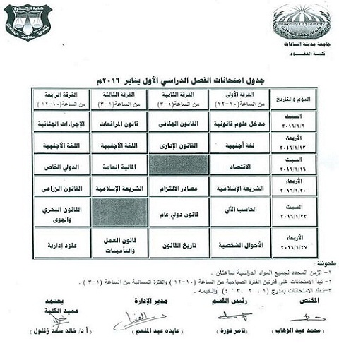 بالصور| ننفرد بنشر جدول امتحانات دبلومتى القانون بجامعة السادات لعام 2016/2015