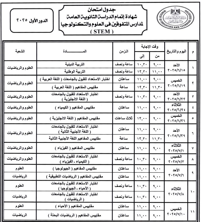 - جدول امتحانات الثانوية العامة 2025 لمدارس المتفوقين