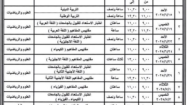 - جدول امتحانات الثانوية العامة 2025 علمي رياضة
