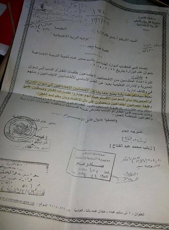 قررت مديرية التربية والتعليم بمحافظة القاهرة منع انتداب أو نقل الاخصائيين الاجتماعيين من إدارتهم، بسبب كثرة الطلابات فى هذا الشأن، نرفق صورة من القرار.