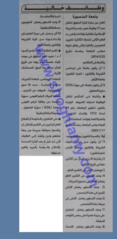 تعلن جامعة المنصورة عن حاجتها لشغل عدد من الوظائف لاعضاء هيئة التدريس، وعلى الراغبين فى التقدم الذهاب الى مقر الجامعة لتسليم السيرة الذاتية.