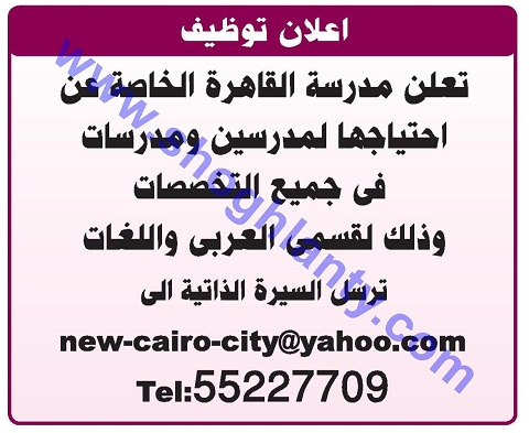 تعلن مدرسة القاهرة الخاصة عن احتياجها لمدرسين ومدرسات في التخصصات التالية: