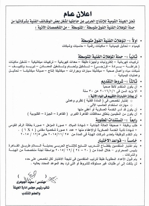 أعلنت الهيئة القومية للإنتاج الحربي التابعة لوزارة الإنتاج الحربي، عن حاجتها لشغل عدد من الوظائف لحملة الشهادات فوق المتوسطة، والمتوسطة، وذلك للعمل في مصانع الهيئة المنتشرة في عدد من المحافظات المصرية.