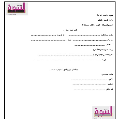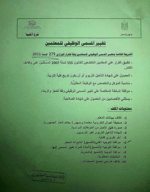 عزيزي المعلم عند التقديم لتغيير المسمى الوظيفى لابد أن يكون المتقدم حاصلا على نفس المؤهل الخاص بمادة التغيير ويتقدم بأوراقه الآتية: