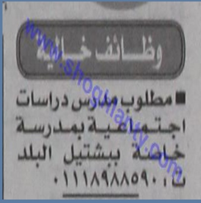 تعلن مدرسة الخاصة ببشيتل البلد عن حاجتها لمعلمين متخصصين فى مادة الدراسات الاجتماعية وعلى المدرسين الراغبين فى التقدم للحصول على وظيفة معلم الاتصال بالرقم التالى:- 0118988590