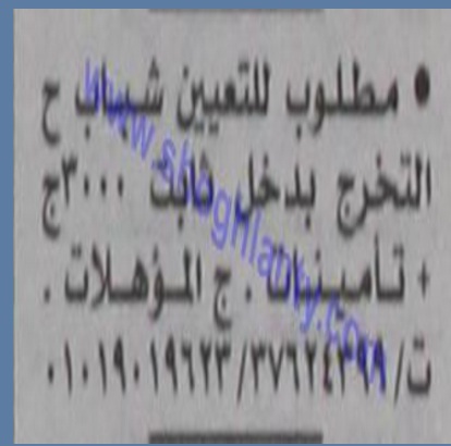 تعلن إحدى الشركات الكبرى عن حاجتها لشغل عدد من الوظائف لجميع المؤهلات حديثى التخرج بمرتب ثابت 3000 جنيه شهريا بالإضافة الى التأمينات، وعلى الراغبين فى التقدم الاتصال على أرقام التليفونات التالية:- 0119019623 او الرقم الأرضى 37624399.