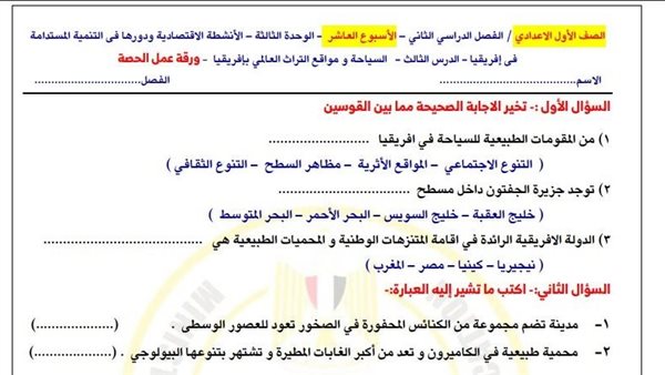 - تقييم الأسبوع العاشر الدراسات الاجتماعية اولى اعدادي ترم ثاني