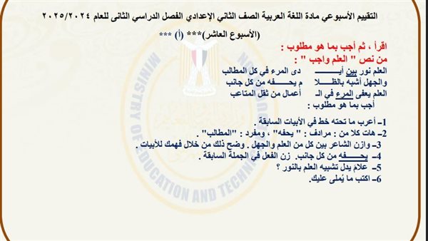 - تقييم الأسبوع العاشر لغة عربية ثانية اعدادي ترم ثاني