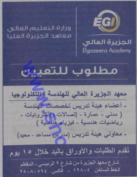 يعلن الجزيرة معهد العالي للهندسة والتكنولوجيا عن حاجتها للتعاقد من أعضاء هيئة تدريس في التخصصات التالية: