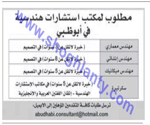 يعلن مكتب استشارات هندسية في أبو ظبي عن حاجته للتعاقد مع مهندسين في التخصصات التالية: