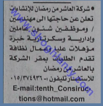 تعلن شركة العاشر من رمضان للانشاءات عن حاجتها الى مهندسين، وموظفين شئون عاملين، من حملة المؤهلات العليا، وعلى الراغبين فى شغل الوظائف تقديم الطلبات بمقر الشركة بالعاشر من رمضان، وللاستفسار تليفون رقم:- 015374936 او على الايميل التالى:- [email protected]