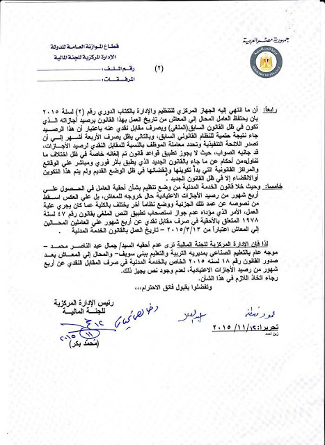 اصدرت وزارة المالية قرارا بعدم احقيه المحال للمعاش بعد صدور قانون الخدمة المدنية رقم 18 لسنة 2015 فى صرف المقابل النقدى عن اربع شهور من رصيد الاجازات الاعتيادية وكان رئيس الجمهورية اصدر قانون الخدمة المدنية خلال بداية العام الحالى وشهد العديد من الاعتراضات من قبل موظفى الدولة فيما تم اقرار اللائحة التنفيذية للقانون بداية شهر نوفمير الحالى.