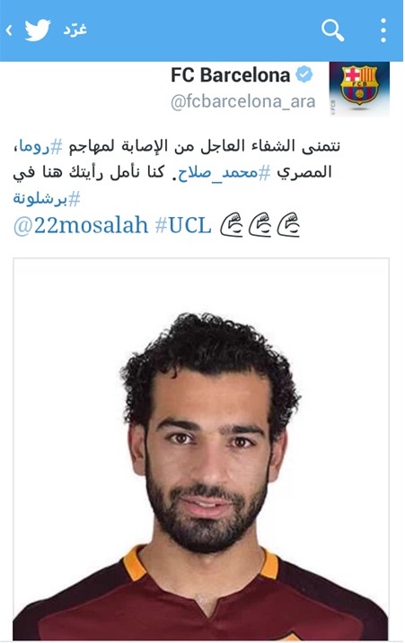 بعثت الصفحة الرسمية لنادي برشلونة الإسباني رسالة إلى محمد صلاح لاعب منتخبنا الوطني وفريق روما الإيطالي قبل لقاء الفريقين الليلة في الجولة الخامسة من دور المجموعات لدوري الأبطال الاوربي.