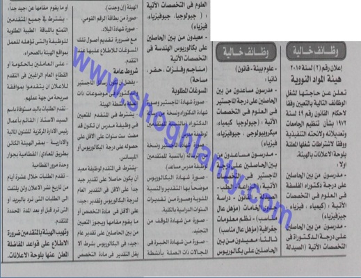 تعلن هيئة المواد النووية عن حاجتها لشغل وظائف مدرسون ومدرسون مساعدون وعلى الراغبين فى التقدم للحصول على شغل الوظيفة تقديم الطلبات باليد فى مقر الهيئة باسم القائم باعمال رئيس الادارة المركزية بالعنوان التالى:- طريق المعادى / القطامية / بجوار وحدة مرور القطامية، على أن تقدم الطلبات خلال عشرة ايام من تاريخ نشر الاعلان.