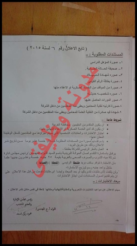 يرفق باستمارة التقدم اصل الحوالة البريدية باسم السيد اللواء المهندس/رئيس مجلس ادارة شركة مياه الشرب والصرف الصحى بالغربية بقيمة 25 جنيه علما بان الاستمارة تتوافر بمكتب بريد طنطا الرئيسى المحطة والصاغة
