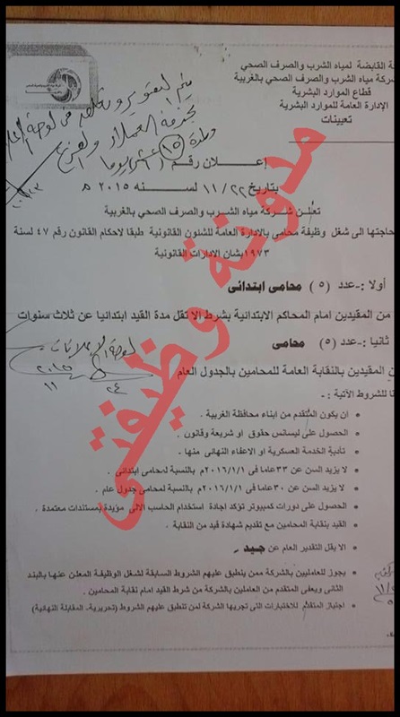تعلن شركة مياه الشرب والصرف الصحى بالغربية عن حاجتها لشغل عدد من الوظائف، وعلى الراغبين فى الحصول على وظيفة التقدم بصور للمستندات الاصلية عن طريق البريد.