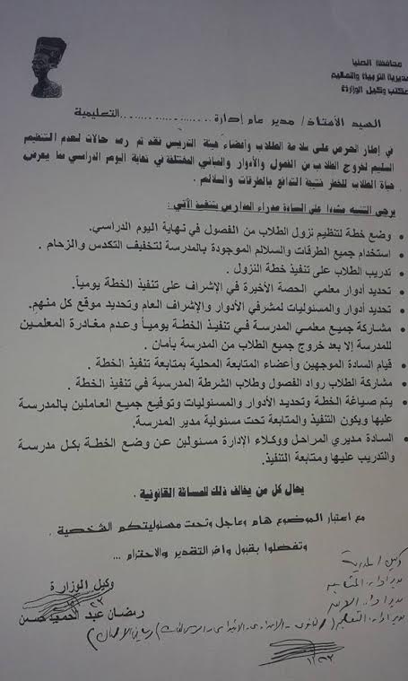أرسل مكتب وكيل وزارة التربية والتعليم بالمنيا منشورا إلى جميع مديرى الإدارات يشدد على ضرورة الالتزام بمعايير الأمن والسلامة فى المدارس حرصا على مصلحة المعلمين والطلاب.