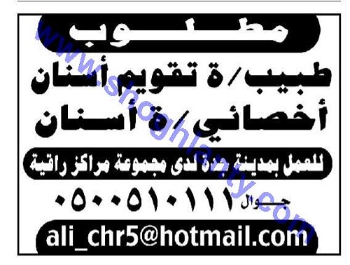 يعلن أحد المراكز الطبية بمدينة جدة بالمملكة العربية السعودية عن حاجته لشغل وظيفة طبيب أو طبيبة أسنان فى أحد فروعه، وعلى الراغبين فى الحصول على وظيفة ارسال السيرة الذاتية على الايميل التالى:- [email protected].