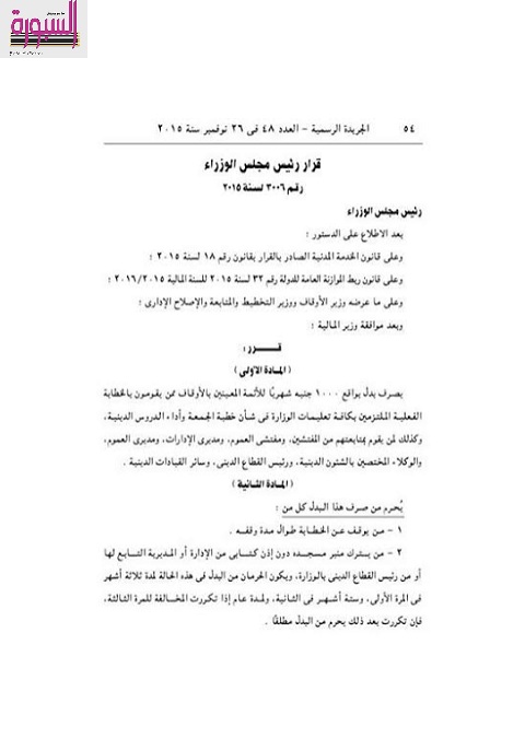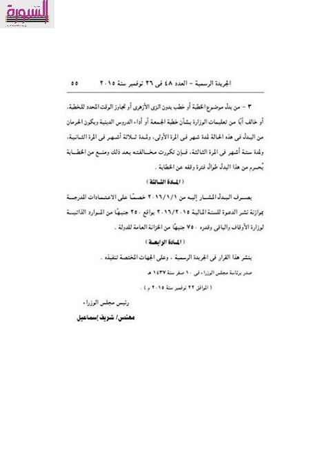 قرار رئيس الوزراء رقم 3006 لسنة 2015، بصرف بدل 1000 جنيه شهريا للأئمة المعينين بالأوقاف ممن يؤدون الخطابة، الملتزمين بجميع تعليمات الوزارة في شأن خطبة الجمعة.ويسرى هذا القرار على المفتشين الذين يتابعون الأئمة، ومفتشى العموم ومديرى الإدارات، ومديري العموم ورئيس القطاع الدينيي وسائر القيادات الدينية .