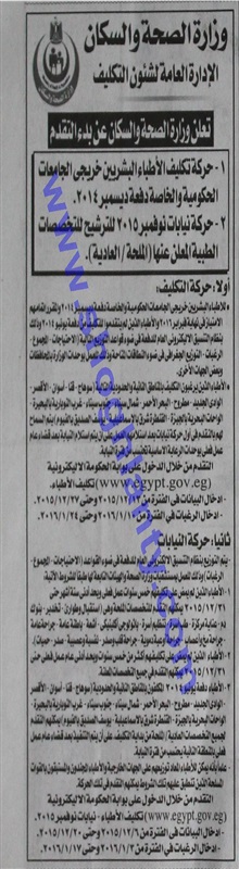 تعلن وزارة الصحة والسكان عن بدء التقدم لحركة تكليف الأطباء البشريين خريجى الجامعات الحكومية والخاصة دفعة ديسمبر 2014، وحركة نيابات نوفمبر 2015 للترشح للتخصصات الطبية المعلن عنها "الملحة/ العادية"، وعلى الراغبين فى التقدم الدخول على بوابة الحكومة الالكترونية www.egypt.gov.eg.