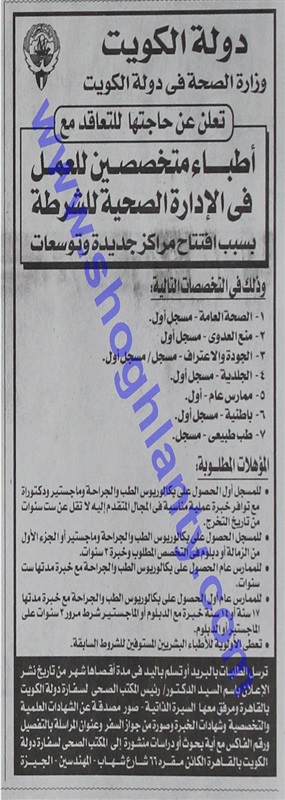 تعلن وزارة الصحة بدولة الكويت عن حاجتها لأطباء فى جميع التخصصات، وعلى الراغبين فى التقدم ارسال الطلبات عن طريق البريد أو تسليمها باليد للسفارة الكويتية بالقاهرة على العنوان التالى سفارة دولة الكويت بالقاهرة/ 66 شارع شهاب/ المهندسين/ الجيزة.