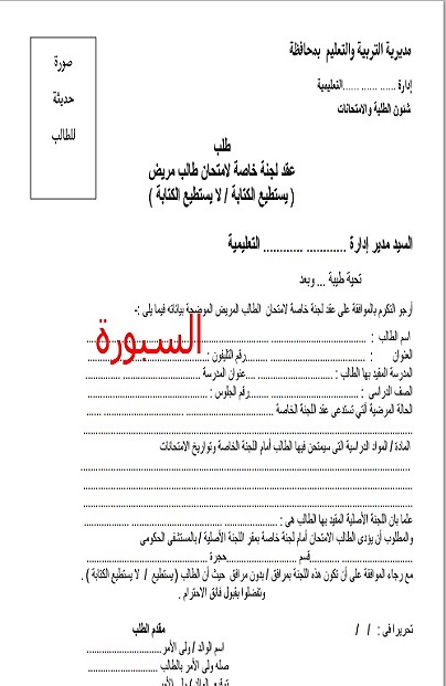 ينشر موقع "السبورة التعليمى" صورة طلب عقد لجنة خاصة لامتحان طالب مريض، خاصة وأن امتحانات الفصل الدراسى الأول على الأبواب، فعلى الطلاب الذين تستوفى حالتهم لجنة خاصة التقدم بالطلب الى مديريات التربية والتعليم التابعين لها.