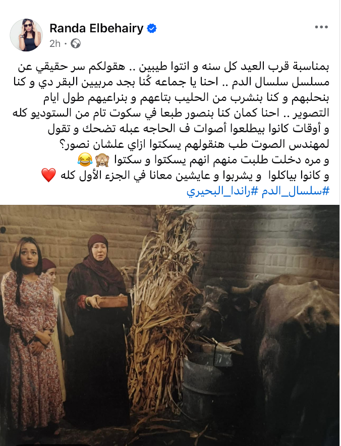 قالت في منشورها:"بما إن العيد قرب، كل سنة وأنتم طيبين.. أحب أشارككم بسر من كواليس سلسال الدم. كنا فعلًا بنربي الأبقار بأنفسنا، كنا بنهتم بيهم، نحلبهم، ونشرب من لبنهم.. وكنا بنعيش معاهم طول أيام التصوير. كان في صمت تام أثناء التصوير، لكن أحيانا كانت البقر تطلع صوت، فتضحك الحاجة عبلة وتقول لمهندس الصوت نعمل إيه؟! وفي مرة طلبنا منهم يسكتوا، وفعلًا سكتوا!"