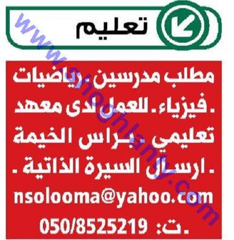 أعلن معهد تعليمي في إمارة رأس الخيمة عن حاجتة للتعاقد مع معلمين في التخصصات التالية:
