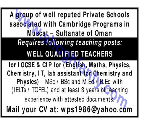 أعلنت عدد من المدارس الخاصة في سلطنة عمان عن حاجتة للتعاقد مع معلمين في التخصصات التالية: