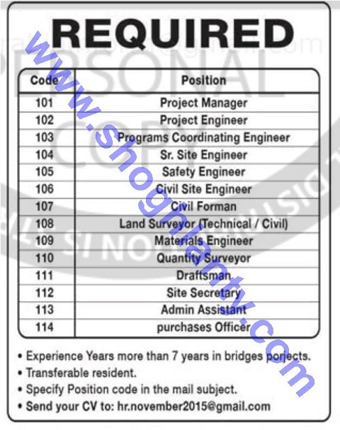 أعلنت شركة مقاولات في دولة الكويت عن حاجتها للتعاقد مع مهندسين في التخصصات التالية: