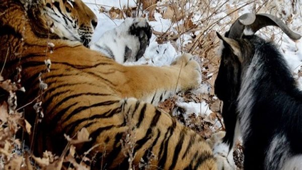 بالفيديو| الصداقة تجمع بين نمر روسي وماعز تمنحه الحياه